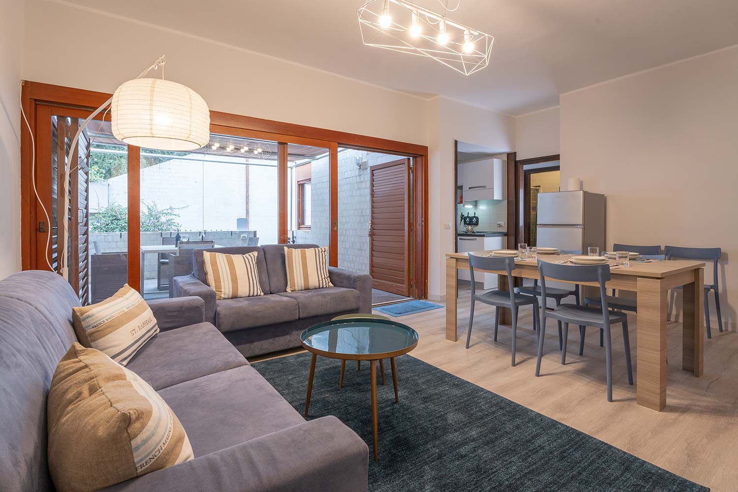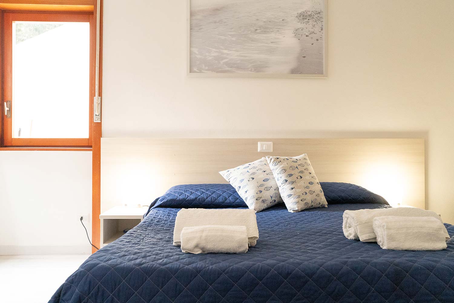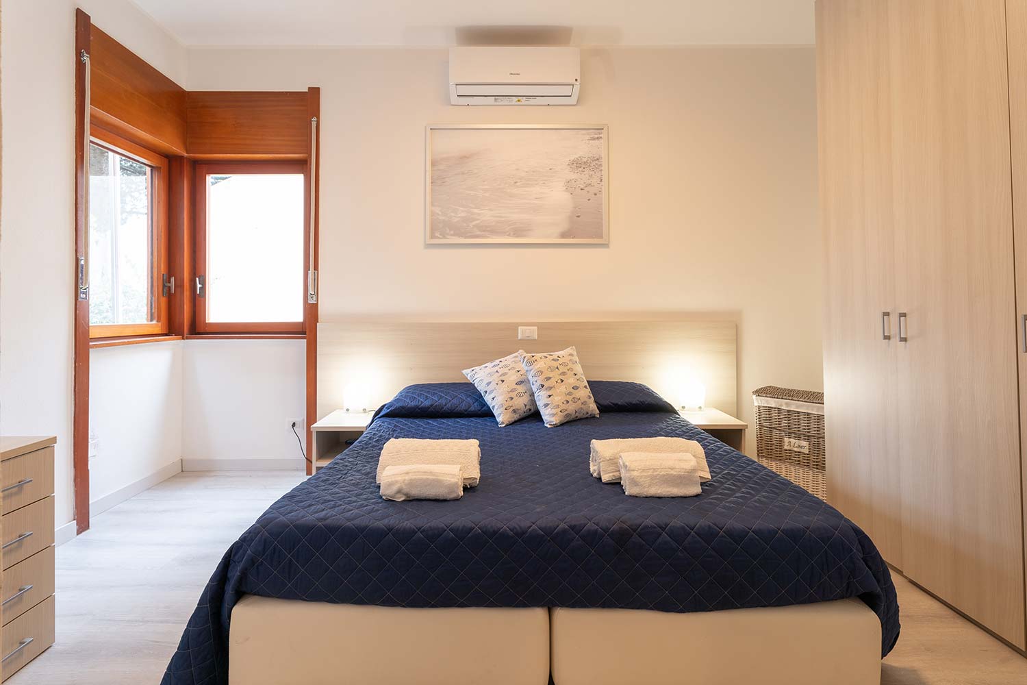 All'interno troverete due camere da letto matrimoniali, di cui una può essere configurata con due letti singoli per adattarsi alle esigenze delle famiglie. Il salone, arredato con un comodo divano, è il luogo ideale per rilassarsi dopo una giornata trascorsa al mare, mentre la cucina è completamente attrezzata con tutto il necessario per preparare i vostri pasti in totale autonomia. Troverete un forno termico, un forno a microonde, un tostapane, una caffettiera tradizionale e una vasta selezione di utensili, pentole e padelle.