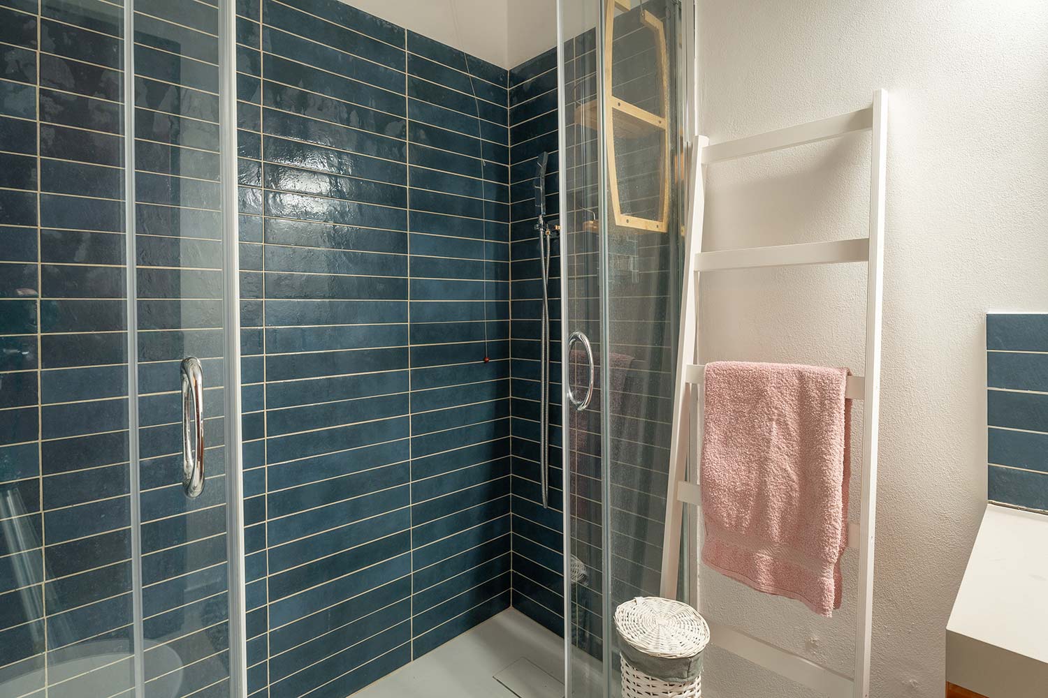 Il bagno moderno e funzionale è dotato di doccia, mentre l'ampio terrazzo di 25 metri quadrati offre uno spazio all'aperto dove potrete godere di piacevoli momenti di relax e gustare i pasti all'aria aperta, grazie al comodo tavolo presente.